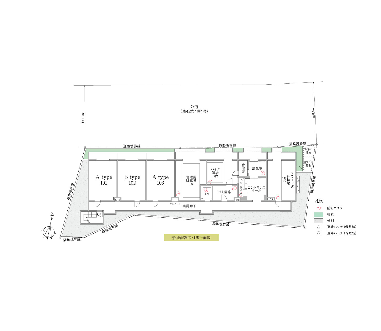 風除室、エントランスホール、管理室、駐車場、バイク置場、駐輪場、ゴミ置場 |