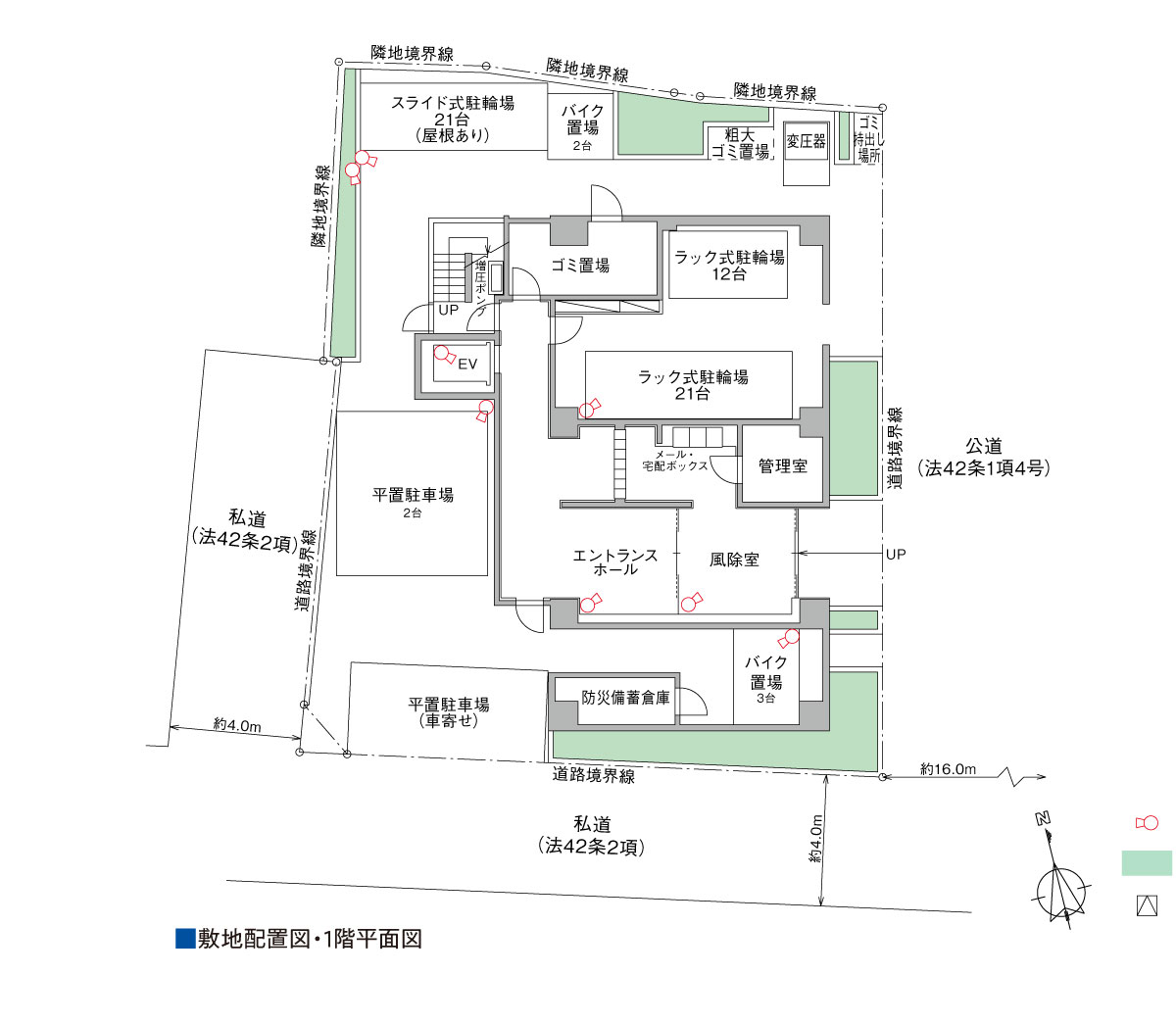 - ■本図面集に記載されている単位はすべてミリメートルで表示してあります。ただし、敷地配置図・1階平面図についてはメートルで表示してあります。 ■建築基準法によりサッシは網入ガラス、網入型ガラスまたは型ガラスとなるところがありますので、予めご了承ください。 ■柱型・梁型、下り天井等の形状については、階数により異なる場合がありますので、予めご了承ください。 ■専有面積には、MB(メーターボックス)・PS(パイプスペース)が含まれています。 ■専有面積は建築基準法による壁芯計算で算出されているため、内法計算で算出される登記簿面積とは若干異なります。また、MB(メーターボックス)・PS(パイプスペース)は登記簿面積には含まれません。 ■すべての専有面積は壁芯計算で算出、また、坪表記については1㎡=0.3025坪で換算し、それぞれ小数点第3位以下は切り捨てしています。 ■居室の帖数表示については1帖=1.62㎡で換算し、小数点第2位以下は切り捨てしています。