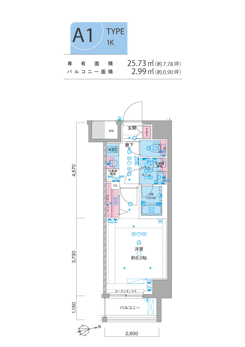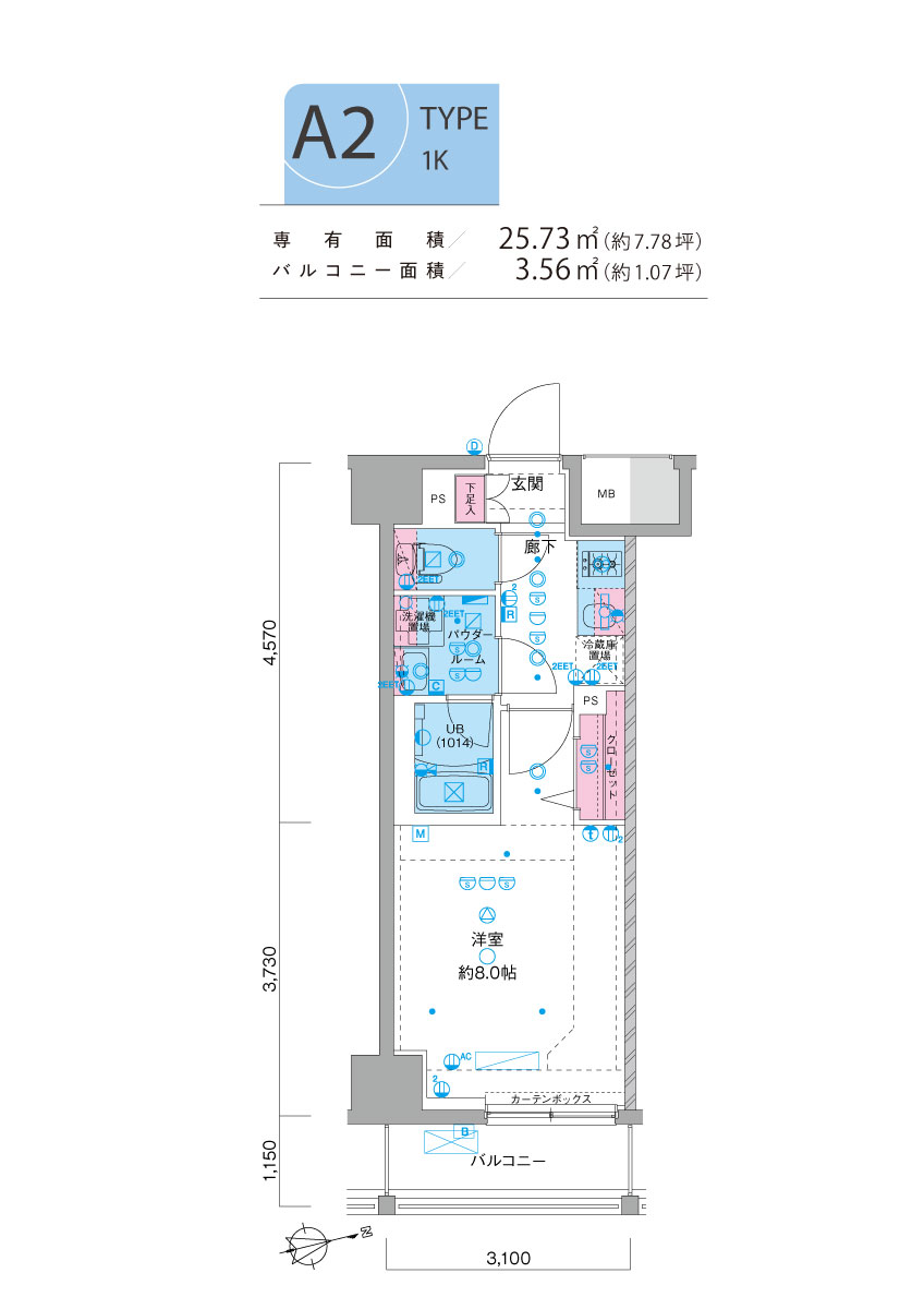 ■ 専有面積/25.73㎡(約7.78坪) ■ バルコニー面積/2.99㎡(約0.90坪) - A2 type | 1K