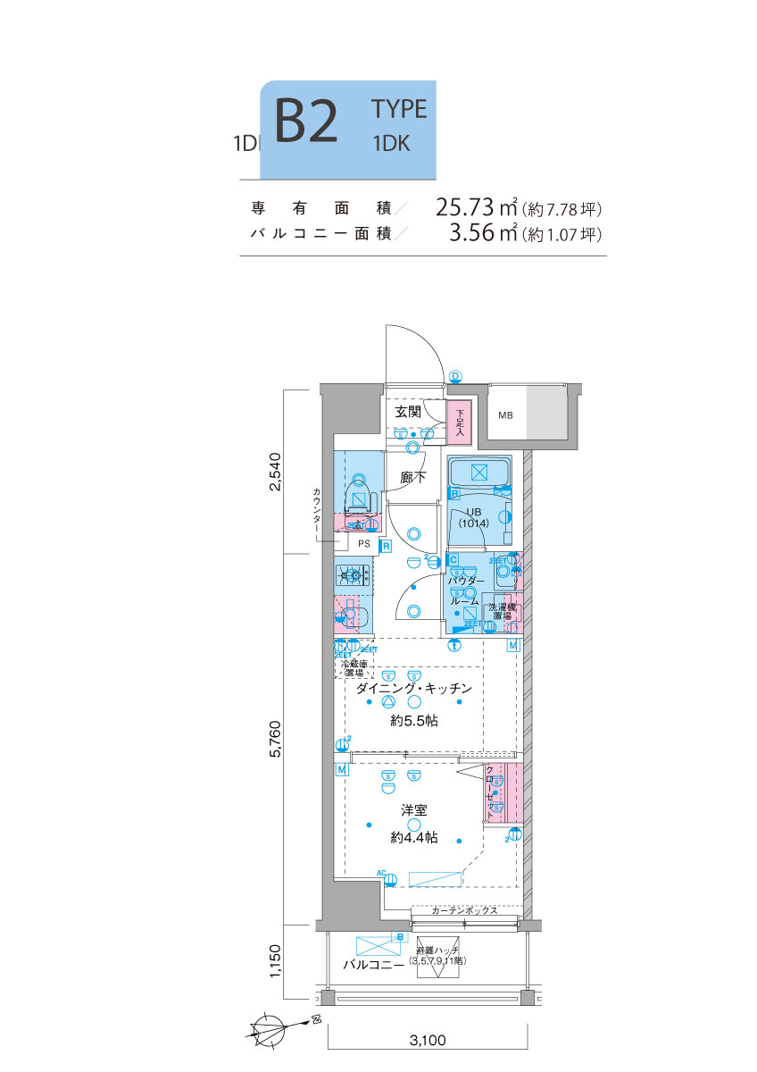 ■ 専有面積/25.73㎡(約7.78坪) ■ バルコニー面積/3.56㎡(約1.07坪) - B2 type | 1DK