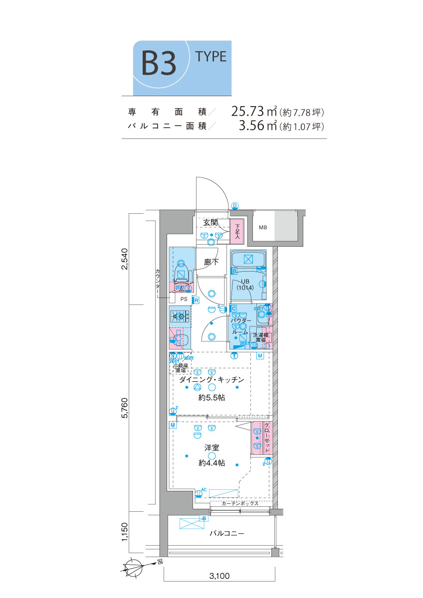 ■ 専有面積/25.73㎡(約7.78坪) ■ バルコニー面積/3.56㎡(約1.07坪) - B3 type | 1DK