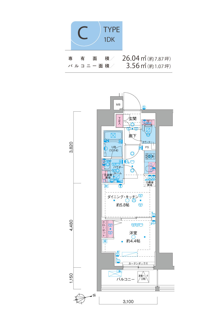 ■ 専有面積/26.04㎡(約7.87坪) ■ バルコニー面積/3.56㎡(約1.07坪)